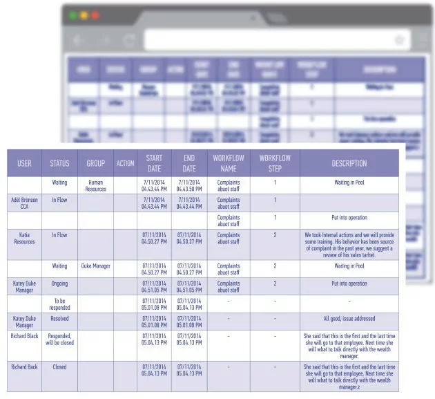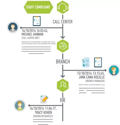 As an example, an issue concerning the bad behaviour of a front desk employee it may engage the Call Center, Human Resource and the Branch Manager.