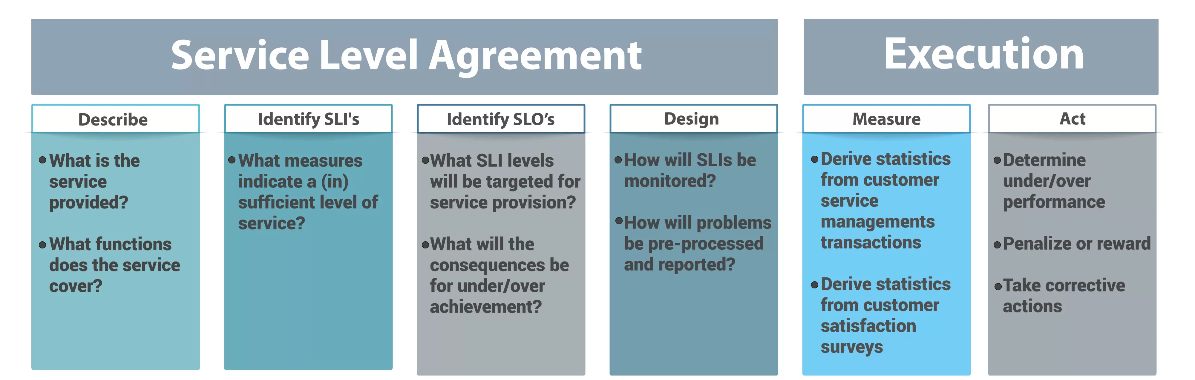 The execution of an SLA necessitates calculation of SLI values and comparison with SLOs to determine performance and follow-up actions accordingly.