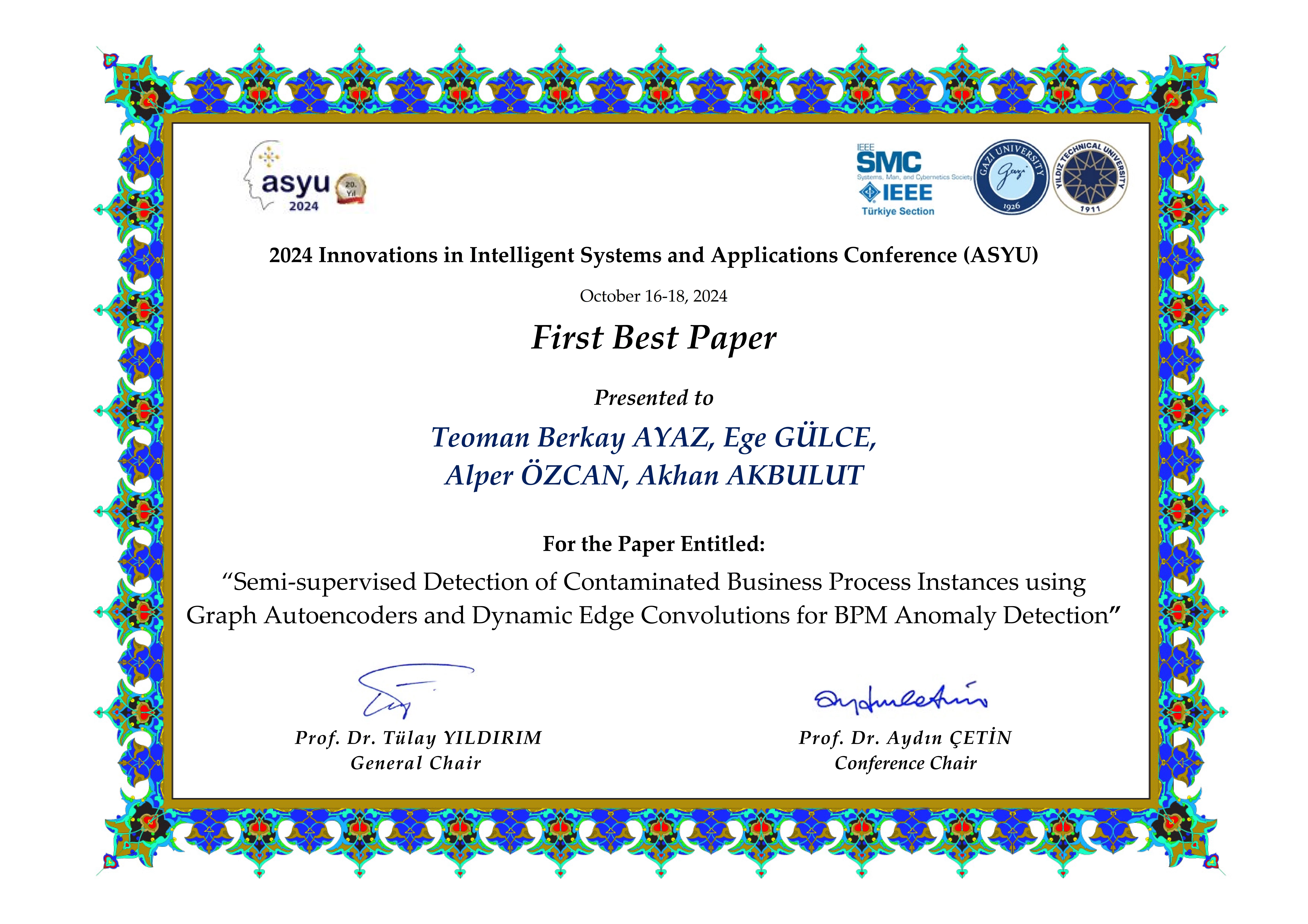 AnomalyNet, graf sinir ağı (GNN) tabanlı bir Otomatik Kodlayıcı (Autoencoder) içerir. Bu mimari, dinamik kenar koşullu konvolüsyon katmanları kullanarak iş süreçlerindeki hem ardışık bağlantıları hem de başlangıç ve bitiş aşamaları arasındaki uzun vadeli ilişkileri öğrenir ve bu sayede anomali tespiti yapar. Çalışmamız gerçek iş süreçleri verisinde test edilmiştir ve yapılan testlerde 0.82 F1 skoru elde etmiştir. Bu skor, modelin kesinlik (precision) ve duyarlılık (recall) performansının ortalamasını yansıtmakta olup, hem yanlış pozitifleri minimize etme hem de gerçek anomalileri yakalama kabiliyetinin dengeli bir ölçüsünü sunmaktadır.